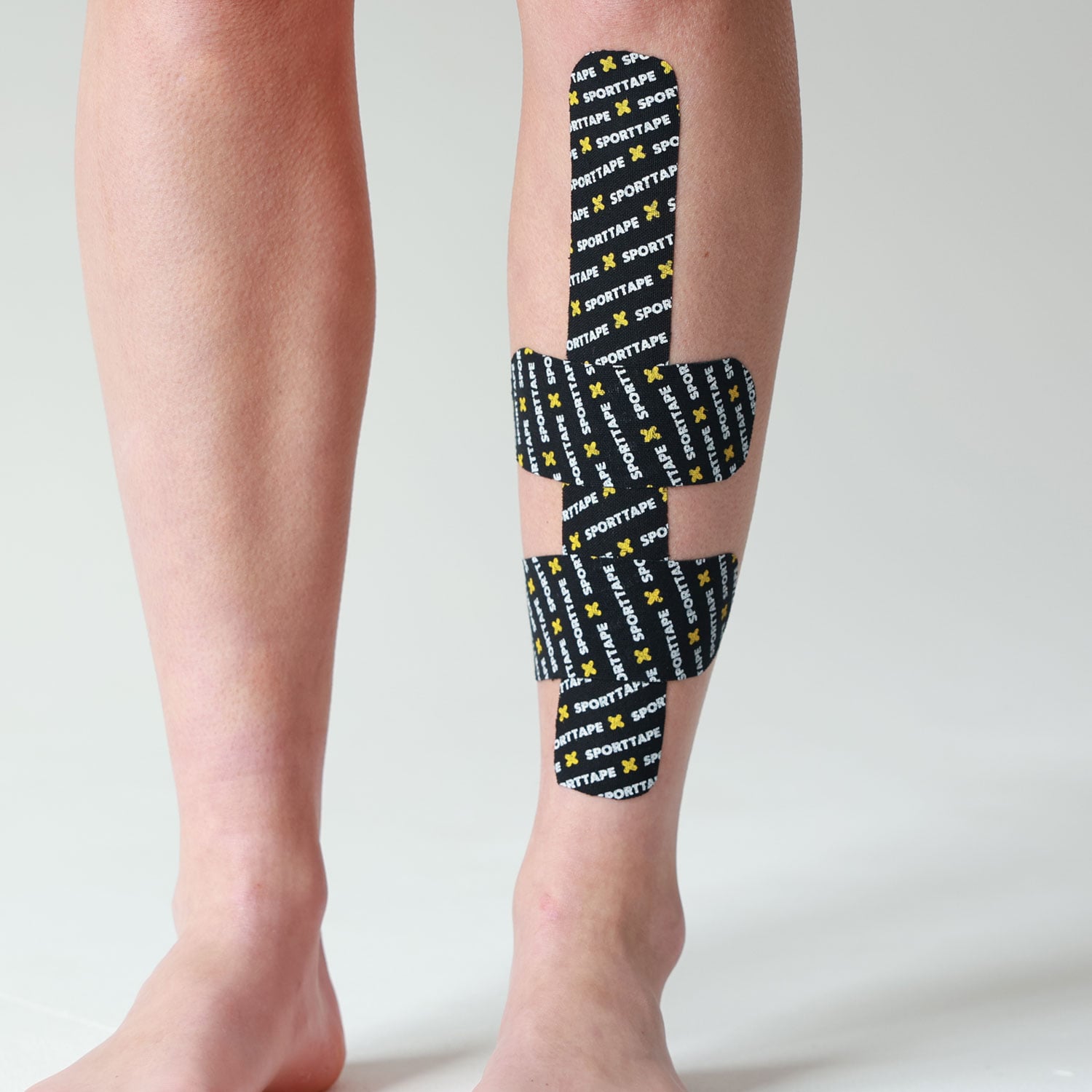 Person wearing SPORTTAPE branded kinesiology tape on the shin